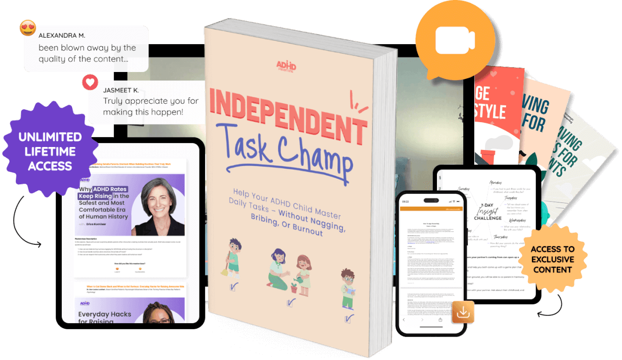 ✔ Independent Task Champ Ebook with ADHD-tailored strategies to help your child complete tasks without constant reminders